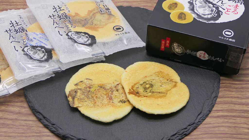 牡蠣まるごとせんべいは商品名の通り、広島県産の牡蠣をまるごと1個乗せて焼き上げた贅沢なおせんべいです。