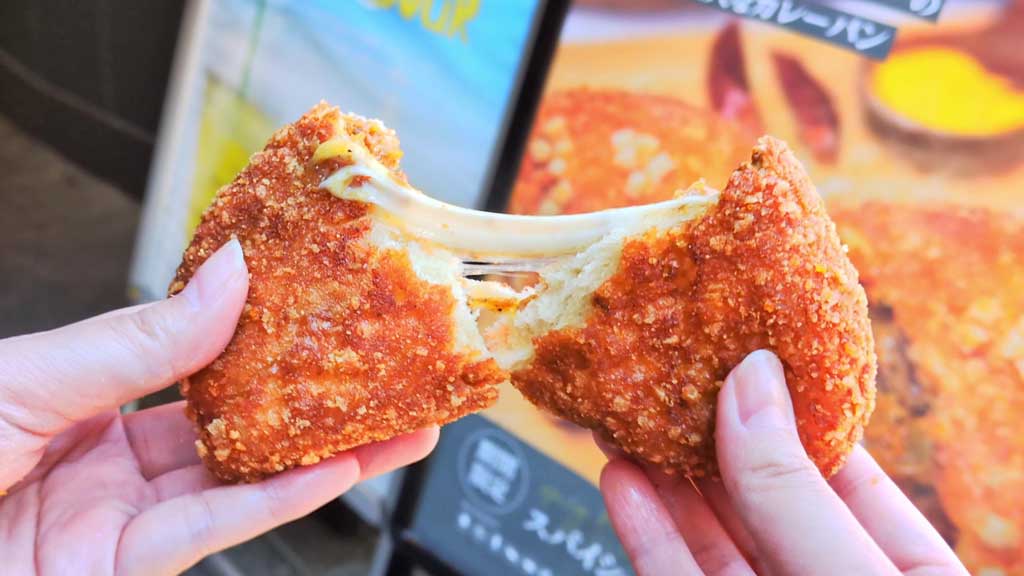 カレーには、30種類のスパイスに香味野菜やフルーツが加えられており、香り高く深みが感じられます。 中にはとろーりとしたチーズがたっぷり入っており、辛いものが苦手な方でも食べやすいカレーパンです。