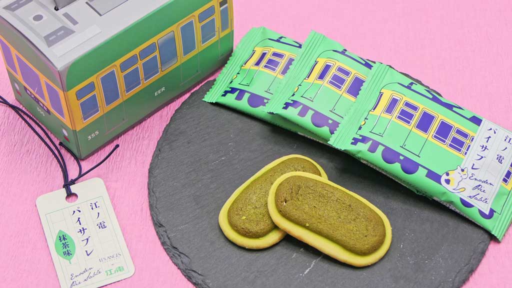 「江ノ電パイサブレ」は、江ノ電のパッケージが特徴的な、江ノ電カラーの抹茶サブレです。