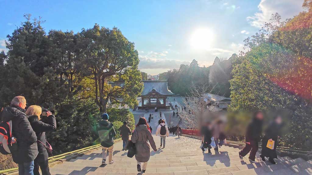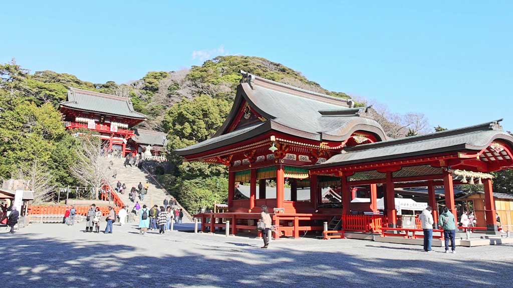 正面参道の「大石段」を上がると、様々な祭事が執り行われる「本宮」があり、国の重要文化財に指定されているこの場所からは鎌倉の街を一望できます。
